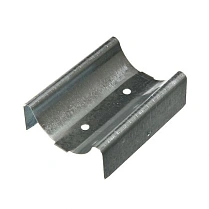 - Продольный соединитель. Используется в качестве соединительного элемента, который увеличивает длину несущих профилей гипсокартона. Имеет форму буквы «П», для максимальной прочности его середина вогнута, с боковых сторон предусмотрены упорные замки. Основной материал — оцинкованная сталь.