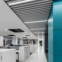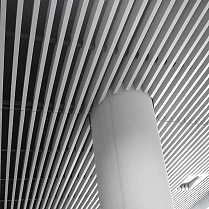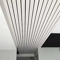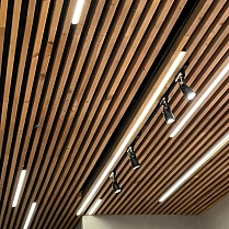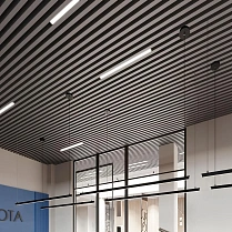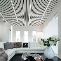 Реечный подвесной потолок состоит из узких панелей (реек), которые крепятся на подвесную конструкцию на некотором расстоянии от потолка. Это оригинальное дизайнерское решение, которое будет органично смотреться в любом помещении. Так как панели чаще изготавливают из металла, отличительной особенностью реечных потолков является высокая устойчивость к влажности, поэтому их часто выбирают для ванных комнат, кухонь, используют в бассейнах.